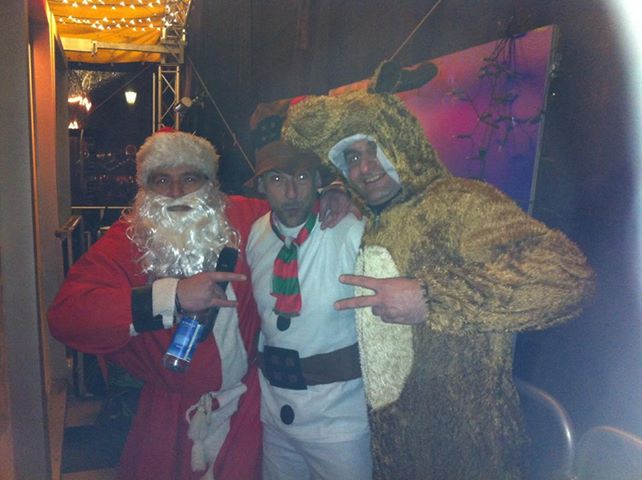 Das Bild stammt aus dem Backstagebereich. Das Rentier an der Gitarre, der Schneemann am Bass und der Weihnachtsmann an den Drums. Singen tut von den Verrückten eh jeder 🙂